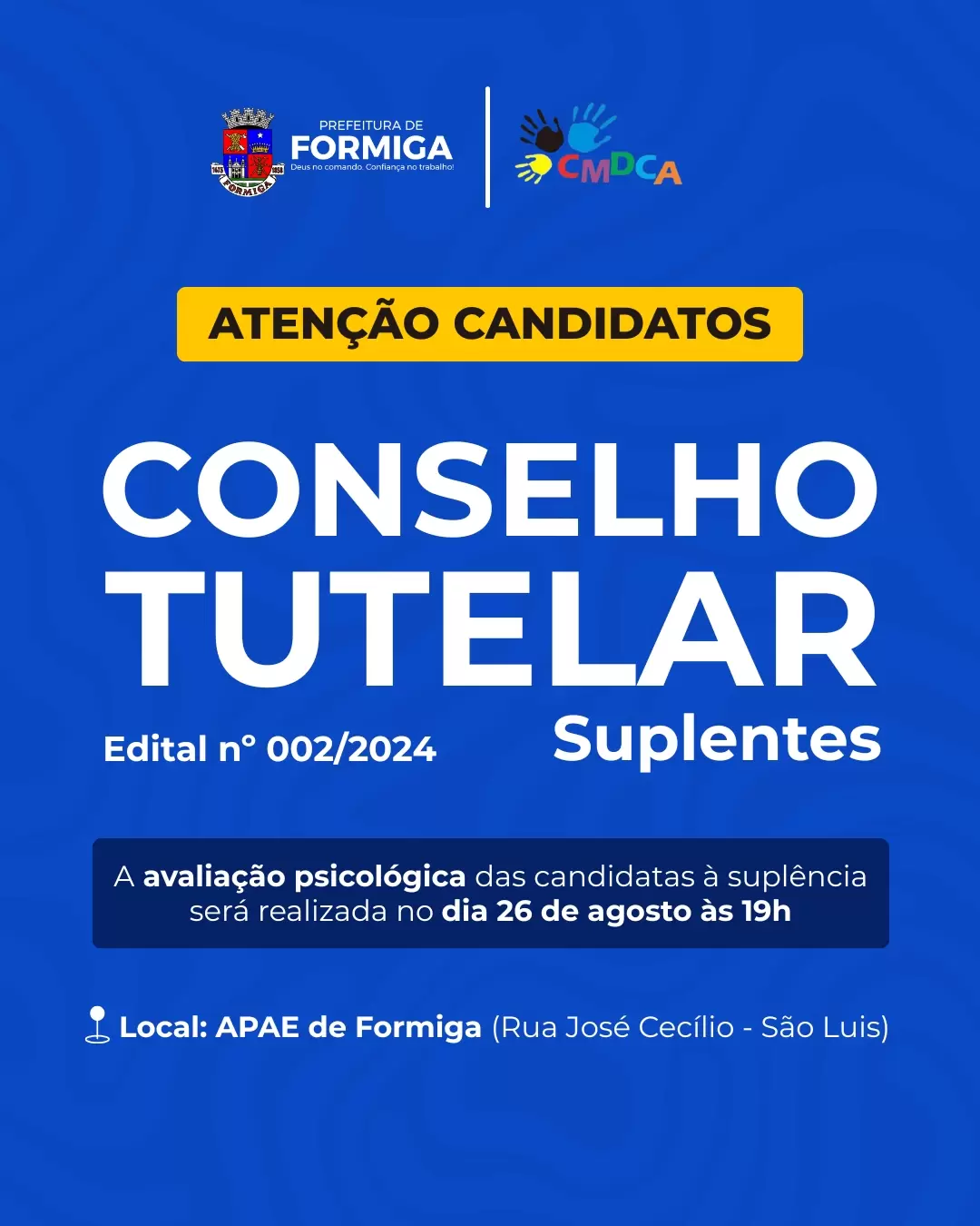 O Conselho Municipal dos Direitos da Criança e do Adolescente (CMDCA) de Formiga anunciou a próxima etapa do processo seletivo para composição do Conselho Tutelar. A avaliação psicológica das candidatas à suplência será realizada no dia 26 de agosto de 2025, às 19h, na sede da APAE de Formiga.