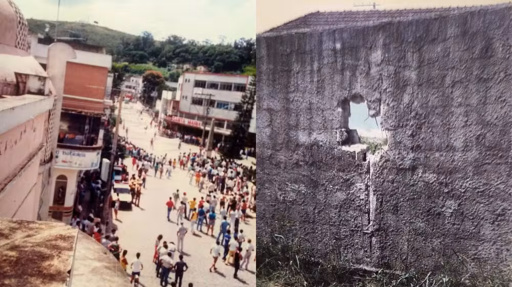 No mesmo dia da queda das bombas, população protestava contra o governo federal no Centro de Formiga em 1987. Um dos artefatos atingiu o muro do Parque de Exposições — Foto: Reprodução/Formiga Fatos e Fotos