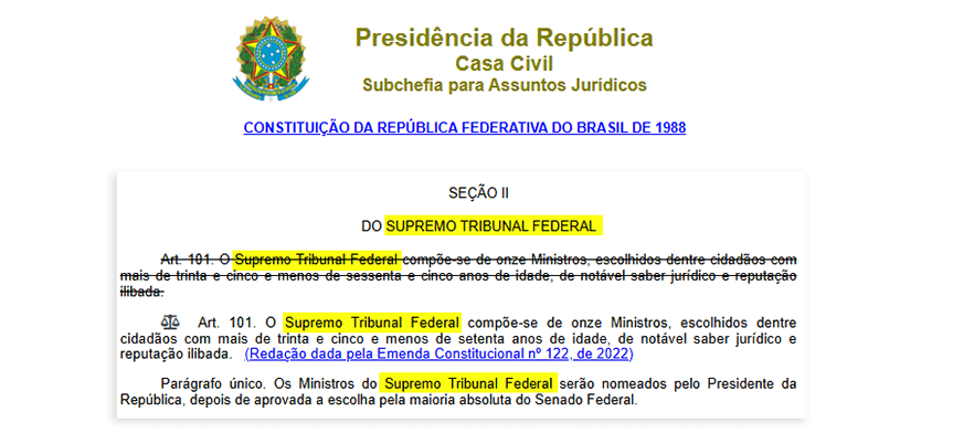 Já o art. 101 define a composição e os requisitos para o cargo de ministro do STF: