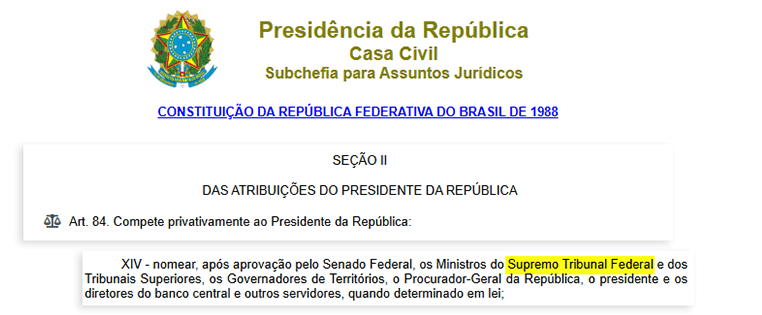 De acordo com a Constituição Federal de 1988, cabe ao presidente da República escolher e nomear os ministros da Suprema Corte, observando critérios de idade, reputação ilibada e notável saber jurídico.