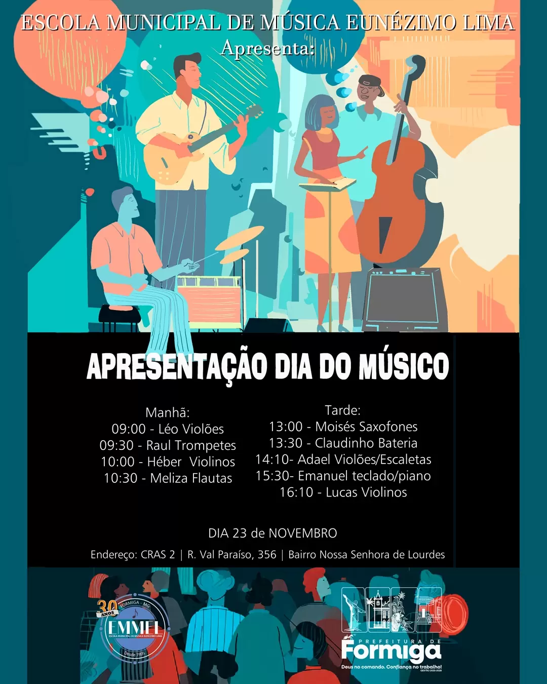 A Administração Municipal, por meio da Secretaria Municipal de Educação e Esportes e da EMMEL, convida toda a comunidade para prestigiar as apresentações em comemoração ao Dia do Músico, que ocorrerão no dia 23 de novembro, no CRAS II, localizado na rua Val Paraíso, 356, no bairro Nossa Senhora de Lourdes.