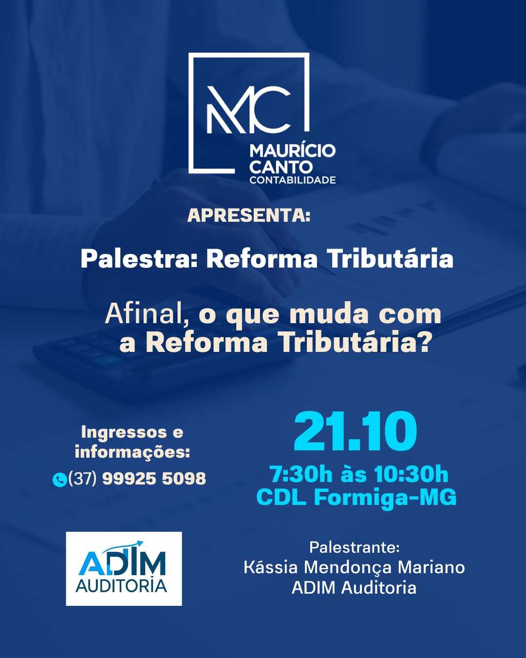 No próximo dia 21 de outubro de 2025, a cidade de Formiga receberá um evento de grande relevância para o setor empresarial. A Maurício Canto Contabilidade promoverá a palestra “Entendendo a Reforma Tributária: Como preparar sua empresa para a transição”, voltada especialmente para empresários da região.