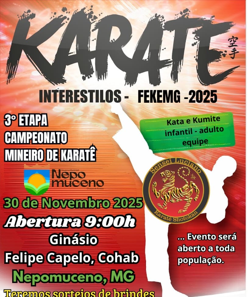 A cidade de Nepomuceno receberá, no dia 30 de novembro, a terceira e última etapa do Campeonato Mineiro de Karatê Interestilos (Fekemg) 2025. O evento, promovido pela Federação de Karatê de Minas Gerais, será realizado no ginásio Felipe Capelo (Cohab), com abertura marcada para às 9h.