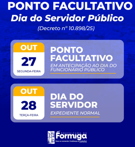A Administração Municipal de Formiga comunicou que os servidores públicos municipais terão ponto facultativo na segunda-feira, dia 27 de outubro, em razão da antecipação do Dia do Funcionário Público, tradicionalmente celebrado no dia 28.