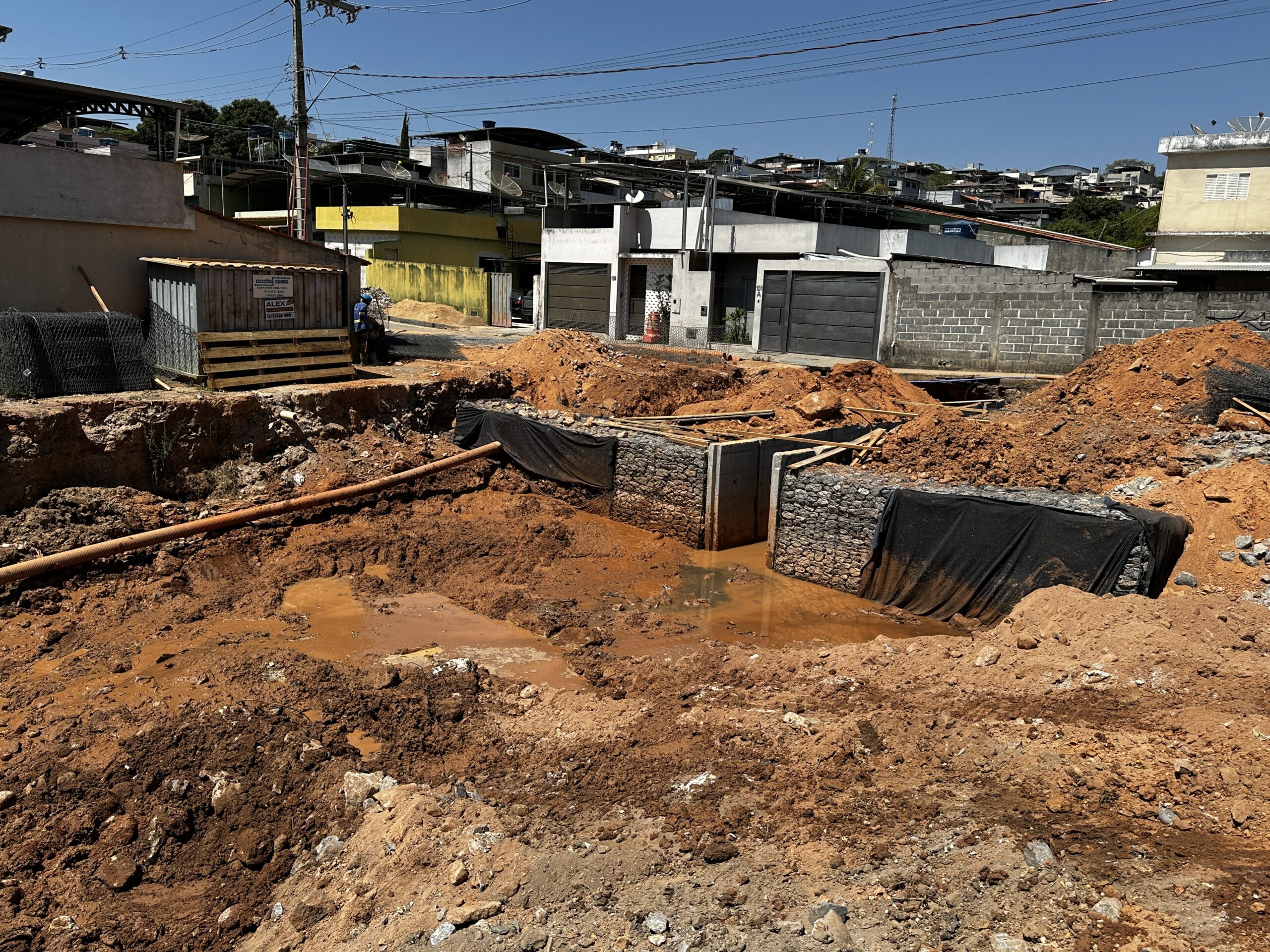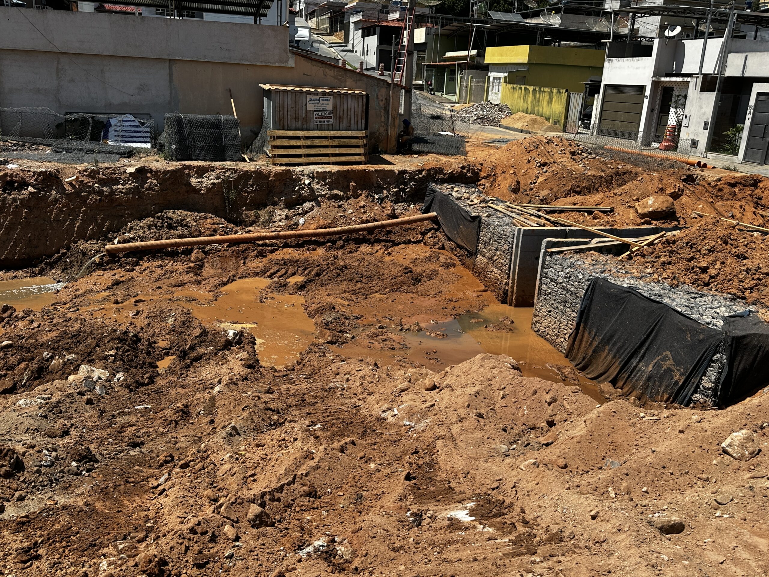 Durante a fase inicial da obra, foi identificada uma instabilidade significativa do solo no leito do córrego, agravada por um rebaixamento acentuado da calha. Essa condição dificultou a obtenção de dados geotécnicos precisos e exigiu soluções técnicas adicionais, como reforços prévios antes da implantação das estruturas de contenção em gabião.