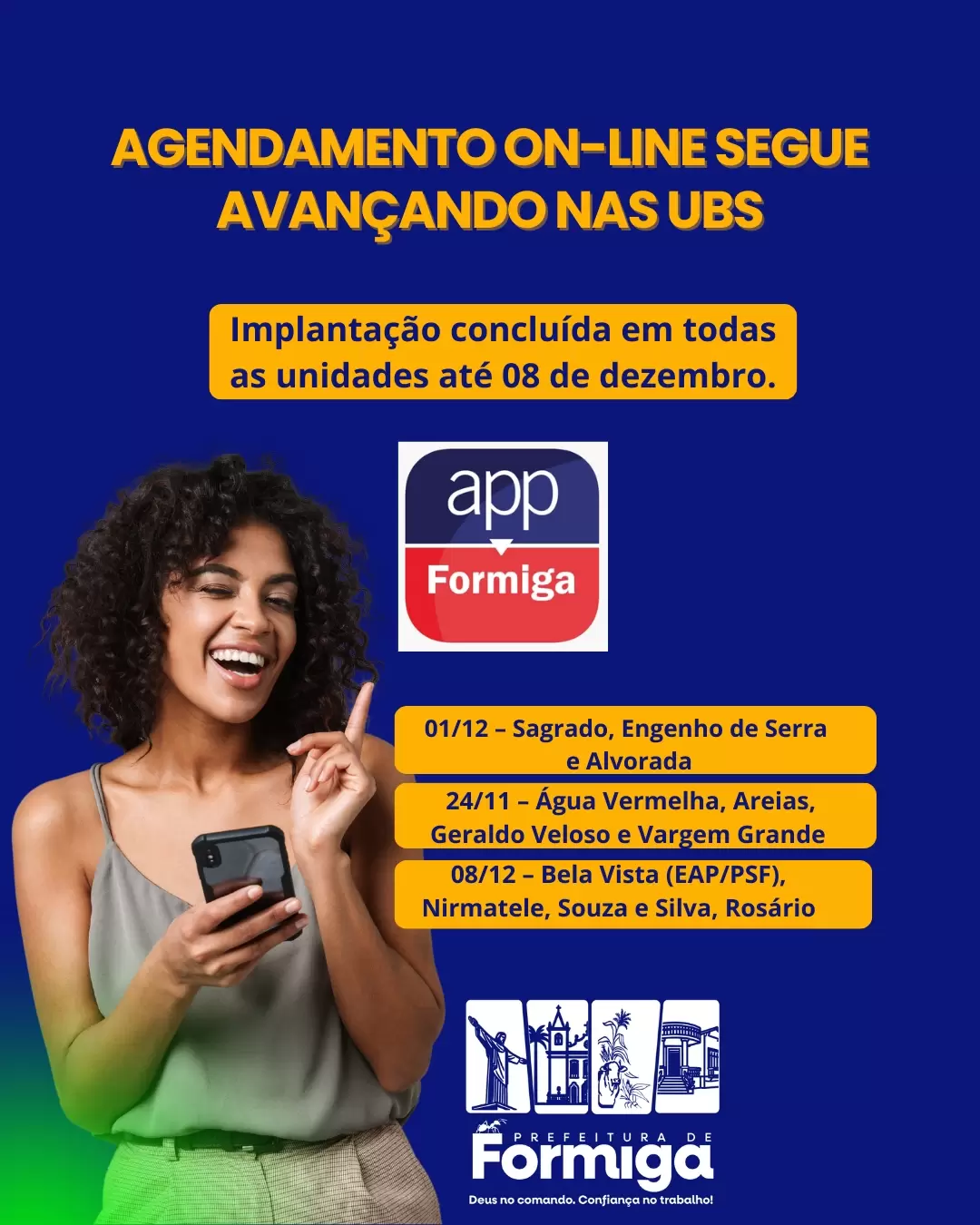 A Prefeitura de Formiga, por meio da Secretaria Municipal de Saúde, está em fase de expansão do sistema de agendamento on-line nas Unidades Básicas de Saúde (UBS). A implantação ocorre de forma gradual e seguirá até o início de dezembro, conforme cronograma definido pelo município.