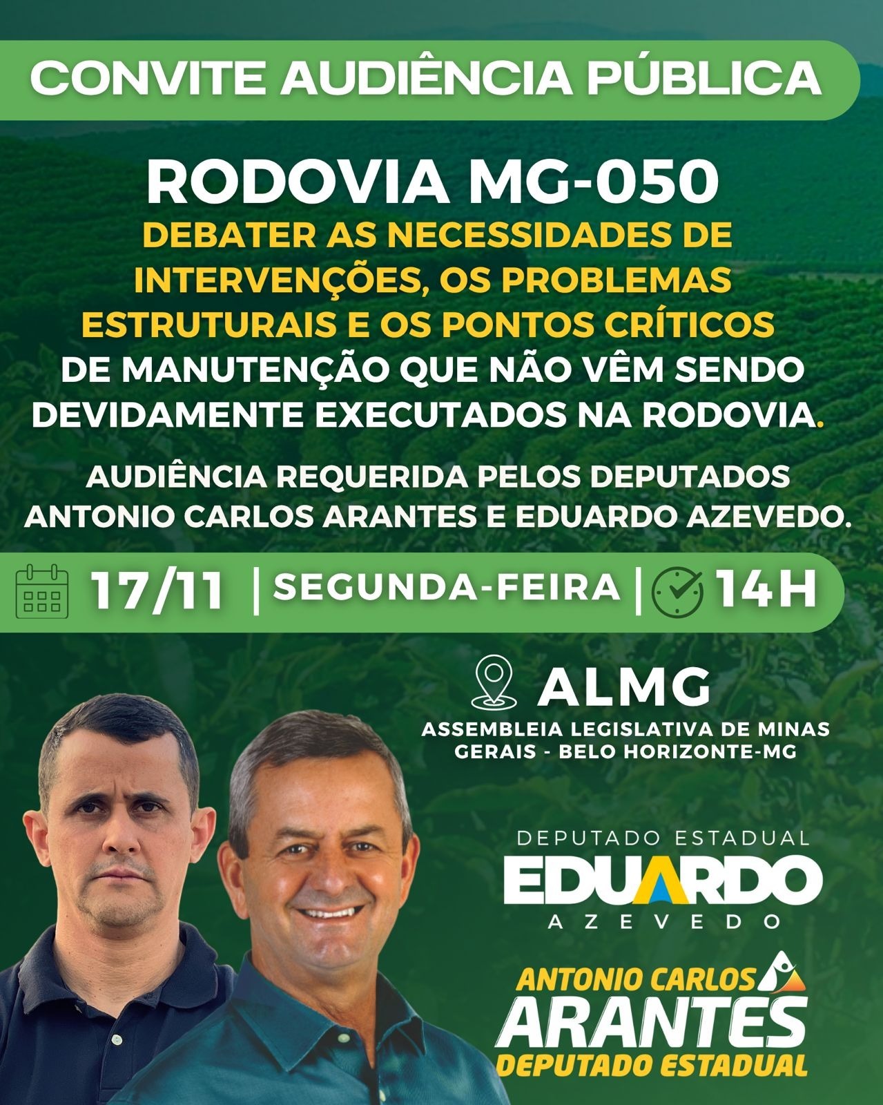 O encontro foi solicitado pelos deputados estaduais Antônio Carlos Arantes e Eduardo Azevedo e tem como objetivo tratar de problemas estruturais, pontos críticos de manutenção e medidas para aumentar a segurança e a trafegabilidade na rodovia. A MG-050 é uma das principais ligações entre o Centro-Oeste e o Sudoeste de Minas Gerais, sendo uma via estratégica para o transporte de pessoas e mercadorias.