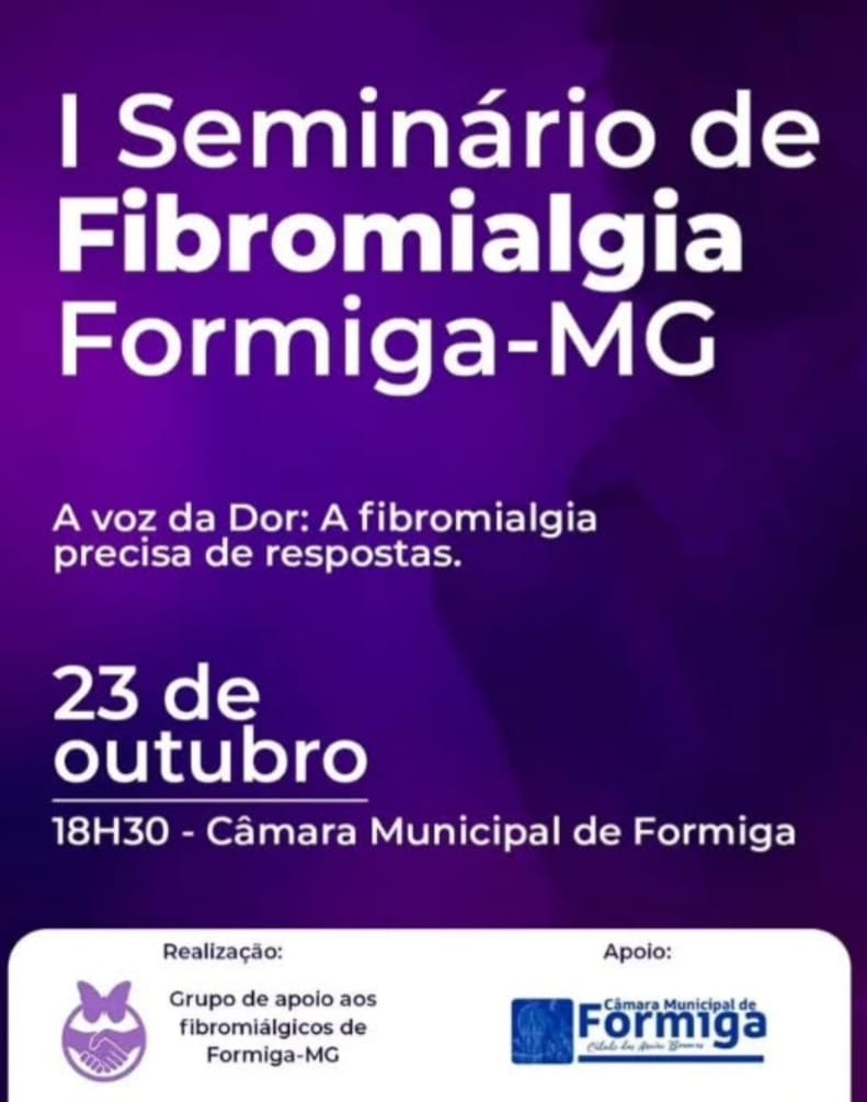 No dia 23 de outubro, às 18h30, o Plenário da Câmara Municipal de Formiga será palco do I Seminário de Fibromialgia de Formiga-MG. Com o tema “A Voz da Dor: A Fibromialgia Precisa de Respostas”, o evento busca promover informação, acolhimento e conscientização sobre a doença que afeta milhares de pessoas.