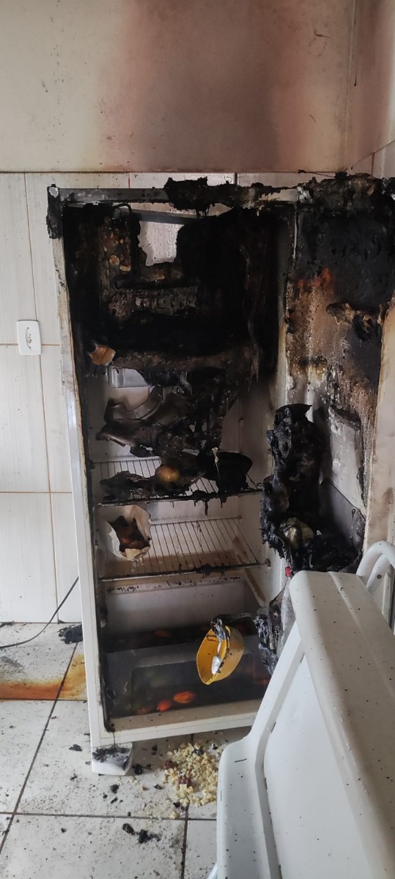 Ao chegarem ao local, os militares encontraram uma geladeira totalmente destruída pelas chamas, que também danificaram o forro de PVC do imóvel. Após o combate ao fogo, a equipe realizou uma vistoria completa na residência para verificar a existência de outros focos ou riscos de reignição. Constatada a ausência de perigo, o imóvel foi liberado.